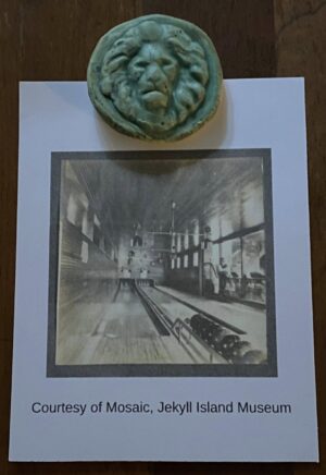 A lion’s head token by local potter Mary Perkins and a Gould Casino postcard were at each place setting.